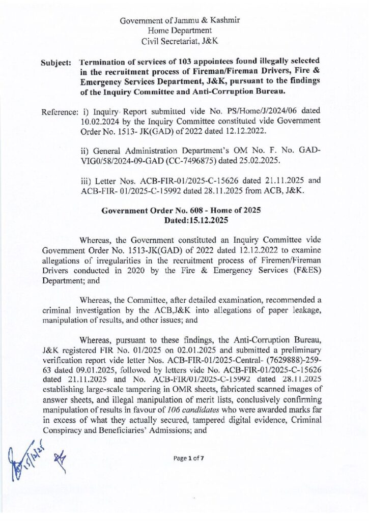 DODA, Dec 15: The Jammu and Kashmir government has terminated the services of 103 firemen appointed in the Fire & Emergency Services (F&ES) Department after an inquiry and Anti-Corruption Bureau (ACB) investigation established large-scale irregularities and manipulation in the recruitment process conducted in 2020.